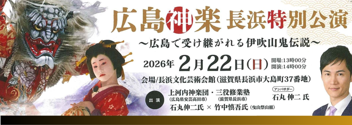 2025年10月長浜市曳山博物館は、開館25周年を迎えました。これを記念して、一般社団法人NEXTひろしま神楽プロジェクト(安芸高田市)とのご縁により、広島県内(芸北地方)に江戸時代から伝わる神事「神...