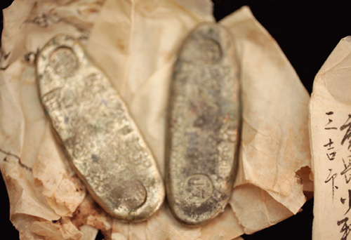 平成25年10月22日(火)、改修をおこなっている土蔵二階隅の大きく頑丈な箪笥一棹を長浜市職員が4人がかりで移動しようと傾けた際、箪笥の中で何かが動く音がしました。中には何も入っていないはずなのに物音がするとは変だと思った職員は、箪笥の床板が外れていることに気がつきました。手探りで探してみると上部には隠れたつまみがみえます。このつまみを引き上げたところ、下部の仕切り板が上昇、箪笥の最下部にもう一つの空間があることを確認しました。その中に小さな二つの桐箱があったのです。箱の中には山吹色に光る小判が顔を出していました。